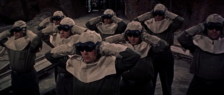 Description: The arrival of the mission team to Navarone Island is marked by two notable sequences that underscore how nature itself can supply precarious environments to situate action. The first is an extended storm, a sequence that runs over thirteen minutes in length, which eventually shipwrecks the mission team’s boat. The second is the scaling of the cliffs of Navarone, which was one of the reasons why Captain Keith Mallory (Gregory Peck) was selected for the mission, given his previous climbing experience. The risk of the ascent is further heightened due to the wet stormy conditions and is undertaken under cover of darkness [Figure 1]. The ascent also activates the falling scenario as the inherent risk of extreme climbing. This risk is realized twice in the sequence. The first is when Mallory slips, but Andrea Stavros (Anthony Quinn) grabs him, representing an embedded rescue [Figure 2]. The suspense to the rescue is further augmented by Stavros’ earlier vow to kill Mallory, who he views as responsible for the death of his family. The second instance occurs when Major Roy Franklin (Anthony Quayle) falls down a section of the cliff face and is severely injured, jeopardizing the overall mission to destroy the large artillery guns [Figure 3]. Adding to the risk of the sequence is the patrolling German soldier at the top of the cliff whom Stavros dispatches by knifing and tossing him over the cliff [Figure 4].